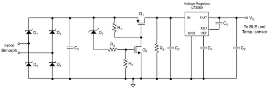 Figure 4 shows the power conditioning circuit, which includes the diode bridge rectifier D1~D4, storage capacitor C2, load resistor R1, PMOS Q1, NMOS Q2, and voltage regulator LT3060 (Texas Instruments, Dallas, TX, USA), where Schottky diodes (D1–D4) with a forward voltage drop of 0.4 V are used to minimize the diode forward voltage drop. The electric charge from the rectified piezoelectric bimorph is stored in the storage capacitor C2. In addition, Q1 and Q2 function as voltage-level-controlled switches that control the release of accumulated energy from C2. The operation of the circuit is divided into two stages. In the charging stage, the storage capacitor charges to the preset value, and in the discharge stage, it discharges to power the rest of the circuit. During the charging stage, Q1 is off, and the voltage regulator is disconnected from C2, D1–D5, R1–R4, Q2, and the piezoelectric bimorph. When C2 charges to VH—the preset upper bound voltage across C2—Q2 turns on, where VH is determined by D5, a 10 V Zener diode, and the resistor divider formed by R2 and R3. During the charging of C2, D5 prevents the current from sinking into the gate of the Q2. When the voltage across C2 reaches 10 V, D5 starts to conduct, thus the current sinks into R2, R3, and the gate of Q2. When the voltage across R3 exceeds 2.2 V, the threshold voltage Vthn of the NMOS, Q2 turns on. Since there is a current path to ground for R1 when the voltage drop across R1 exceeds −1 V—the threshold voltage Vthp of the PMOS—Q1 turns on. When Q1 turns on, C2 discharges through Q1 and the voltage regulator to the rest of the circuitry. Immediately after C2 starts discharging, R4 (4.4 MΩ) forms positive feedback to guarantee that Q1 is on, which is enabled by forming another voltage divider with R3. The voltage regulator generates an output voltage of 2.5 V with an input voltage range from 1.6 V to 45 V and a maximum output current of 100 mA. This is ideal for the proposed power conditioning circuit since C2 starts to discharge (turns on) through the voltage regulator when the voltage across C2 reaches VH.
