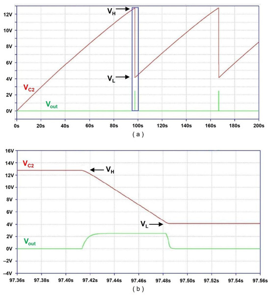 Figure 5a,b show the voltage waveform across C2 and the voltage regulator output waveform obtained from the circuit simulator. The red waveform shows the voltage across C2, and the green waveform shows the voltage regulator output. The voltage across C2 rises until it reaches VH (=12.6 V) and drops until it reaches VL (=4.1 V). The charge accumulated in C2 during the charging process (0 V to VH) is transferred during the discharge process (from VH to VL) through the voltage regulator. Figure 5b shows the close-up view of the voltage regulator output and C2 voltage transition from 12.6 V to 4.1 V.