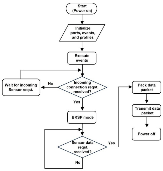 The embedded code for the BLE module is realized by using the application program interface (API) that enables the creation of custom applications. Figure 8 shows the various stages of the BLE module’s embedded code and how it is used to transmit data packets to the Bluetooth dongle connected to the PC. The BLE module powers up when it receives power from the voltage regulator. During power-up, the module initializes all the hardware blocks, powers-up notifications, as well as sets up events, generic attribute profile (GATT) services, and user applications. The BLE module then waits to receive over-the-air (OTA) BlueRadios serial port (BRSP) mode connection requests. Once the BLE module receives a BRSP mode connection request, it connects to the Bluetooth dongle. After a connection is established, the sensor data request packet is sent from the Bluetooth dongle to the BLE module. The packet is received through the UART of the BLE module. If the BLE module does not receive a sensor data request packet, it continues to wait for the data request packet. The Bluetooth dongle continuously transmits a sensor request packet until it receives a packet of data. The data packet together with a CRC is built and transmitted to the Bluetooth dongle after the BLE module receives the request for sensor data.