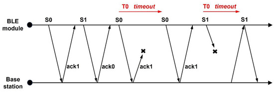 The data protocol involves a set of digital rules for data exchange between the BLE module and the Bluetooth dongle. The protocol consists of the header and the payload, where the header is divided into the packet type and a CRC polynomial for data integrity checking. The payload includes a sequence number, different data packets, and a flag that indicates the end of the payload. For the proposed self-powered wireless sensor platform, a stop-and-wait automatic repeat request (ARQ), as described in Figure 9, is implemented. In this case, the BLE module sends the first packet with a zero-sequence number (S0). Upon receiving the packet, the base station (dongle) checks the sequence number for zero and then sends an acknowledgment (ack1) in the form of a packet for the following data. The BLE module then transmits the next packet with a sequence number of one (S1). The process repeats with the base station sending an acknowledgment (ack0) for the next data packet with the sequence number zero (S0). In addition, the timeout is included at both ends to ensure the safe delivery of data. As shown in Figure 9, when the BLE module does not receive an acknowledgment (example ack1) within a specific time window (T0), it re-transmits the packet with the same sequence number (S0) as the previous transmission. The base station also waits for a specific time window (T0) to receive data (for example, with the sequence number, S1) from the embedded module, and then sends another acknowledgment (ack1) for data if it did not receive any data within the specified time frame. The base station always asks for the current data and does not care about previously sampled data, as data from the proposed sensor platform (regarding foot temperature) do not vary much between sampling times. The foot temperature measurement is performed with an accuracy of 0.1 °C using a 16-bit data size, where the packet size is limited to 18 bytes.