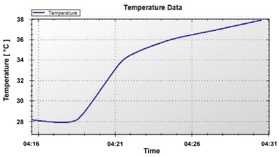 Before performing the temperature measurement (experiment to determine the transfer function between the temperature and output voltage of the temperature sensor’s readout circuit), it is necessary to calibrate the resistive temperature sensor used in this work. This is important because the initial resistance can change with environmental conditions, such as humidity, and with manufacturing variations due to the conditions under which they were made. Toward this end, we measure the initial resistance of the sensor at 25 °C (room temperature). We set the initial resistance of the potentiometer to a value higher than the sensor’s resistance so that the output voltage of the amplifier is about 100 mV, and then start the temperature sensing. The sensor calibration is a one-time process that is performed before using the sensor platform, where the calibration compensates for the manufacturing variations of R1 and Rp used in the temperature sensor readout circuit, as shown in Figure 6. To find the output voltage of the temperature sensor readout circuit, the temperature was varied from 25 °C to 45 °C (target detection range), and the output voltage corresponding to each temperature level was monitored for 100 cycles, where the average temperature–voltage relationship is given as follows: