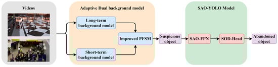 The abandoned target detection method, which combines the adaptive double-background model and SAO-YOLO, mainly accounts for the noise effect brought about by scene changes through the design of the adaptive double-background model, and is capable of dynamically adjusting the learning rate of the background model, enabling it to adapt to diverse environmental conditions. This ability allows the model to extract real target features more stably in the face of a complex background, thereby reducing false detections and missed detections. The improved PFSM model is based on the enhanced Foreground segmentation model (PFSM), which can identify and extract suspicious static foreground objects more precisely, further enhancing the detection capability of small targets and occluded targets. By utilizing the established adaptive dual-background model, the PFSM model can effectively separate the foreground and background, enhancing the ability to extract target features. In terms of the optimization of the SAO-YOLO model, it can extract the features of small targets and occluded objects more fully by employing a specific feature extraction network such as SAO-FPN. This network design emphasizes the fusion of multi-scale features, that is, to ensure that the key features of small objects can be effectively recognized even at low-resolution inputs. Simultaneously, the design of the SAO-Head decoupling head enables the model to accurately extract features of small objects and partially occluded objects. By processing the features independently, the decoupled head avoids the mutual interference of information, thus improving the accuracy of target recognition.