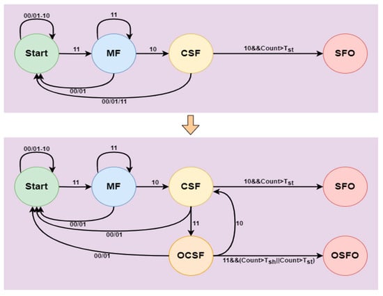 This paper makes improvements based on the PFSM (Pixel-based Finite State Machine) model by adding an occlusion state to further enhance the accuracy of suspicious objects (static foreground objects) detection. Initially, the established long-term and short-term background models are binarized. The binarized image of the long-term background model is labeled as , and that of the short-term background model is labeled as . Based on the different binary information, the state transitions are made, and the binary representation of pixel at time is determined as follows: