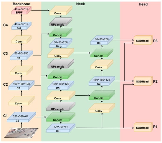 Specifically, the input image is first normalized and resized to a uniform size of 640 × 640 × 3 (length × width × channels, where the length and width are in pixels). Next, the Backbone part, which has been streamlined, performs an initial feature extraction, resulting in a feature map of 40 × 40 × 512. Then, in the Neck part, a series of operations such as convolution, concatenation, upsampling, and pooling are conducted to produce three feature maps of 320 × 320 × 64, 160 × 160 × 128, and 80 × 80 × 256. Finally, the obtained feature maps are passed through the SODHead decoupled head for prediction and classification. P1, P2, and P3 represent the three different scales, with P1 and P2 retaining finer texture features, making them better suited for detecting medium and small objects.