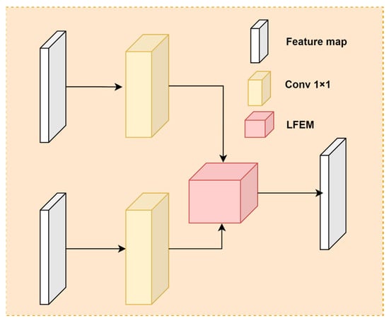 Basic structure diagram of the SODHead. SODHead mainly consists of 1 × 1 convolutions and the LFEM module. The high-level and low-level feature maps are preprocessed separately using 1 × 1 convolutions before being input into the LFEM module, which outputs the final feature map.