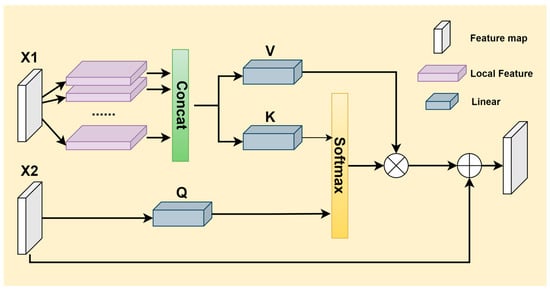 Let the input from the lower detection layer be denoted as X1, and the input from the higher detection layer as X2. In the lower feature layer, X1 is first subjected to cropping, padding, and rearrangement operations to fully collect local feature information. Subsequently, two linear layers are used to construct vectors K and V, where K is used to calculate the similarity between features, and V is used to create a new output vector. In the higher feature layer, a linear layer is used to construct the Q vector, which captures essential information from the higher feature layer and provides a basis for calculating attention weights. The computed Q vector and K vector are then multiplied point-wise and normalized to compute attention scores, which are further normalized using operations like Softmax to produce the final attention weights. Finally, the normalized attention weights are used to perform a weighted summation of the V vector, which is then combined with X2 to produce the final output feature map.