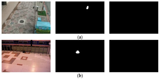 In recent years, deep learning-based object detection methods have made significant progress, with convolutional neural networks (CNNs) playing a crucial role in object detection due to their high detection accuracy. Convolutional neural network-based object detection models are primarily divided into two categories. The first category is single-stage models, which use CNNs to directly predict the category and location of objects. These models perform classification and regression in a single pass, omitting the candidate box generation stage, resulting in faster detection speeds. Representative models include the YOLO series [7,8,9,10,11,12] and SSD [13]. The second category is two-stage models, such as Fast R-CNN [14], Faster R-CNN [15], and Mask R-CNN [16]. These models first use CNN to generate candidate regions and then perform classification and regression on these regions, leading to slower detection speeds but higher accuracy. These techniques are widely applied in various fields, including video surveillance, security, industry, and agriculture. As a result, the performance of abandoned object detection methods has significantly improved under two mainstream approaches: (1) abandoned object detection methods based on deep learning technology, offering excellent detection accuracy, and (2) methods that combine traditional computer vision techniques with deep learning technology, balancing detection speed and accuracy. Abandoned object detection methods that integrate computer vision and deep learning technologies can maintain high detection accuracy while achieving faster detection speeds, making them highly valuable for practical applications and the current mainstream approach to abandoned object detection [17,18,19,20,21]. However, in existing public space video surveillance, accurate detection of discarded objects remains a challenge due to the frequent presence of small objects that are obscured, as shown in Figure 1. These objects typically demonstrate characteristics such as few pixels, lacking feature information, occlusion, and truncation, which result in significant false positives and false negatives.