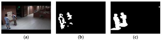 (a) The original frame from the first scene of the ABODA dataset, (b) The output result of the traditional mixture of Gaussians model for the same frame in this scene, (c) The output result of the adaptive mixture of Gaussians model for the same frame in this scene.