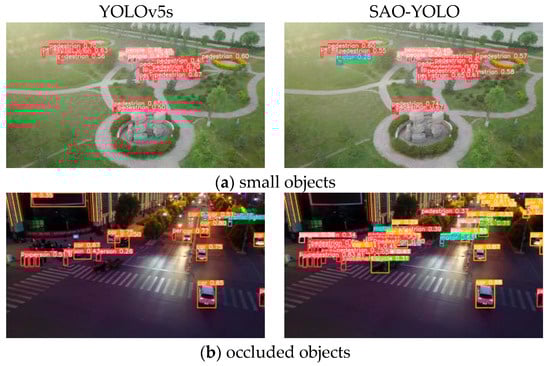 Complex scenarios of abandoned object detection frequently entail issues like small objects and objects occluded by crowds. In the comparison of small object detection presented in Figure 10a, the baseline model misses the motorcycle beside the pedestrian, while the improved SAO-YOLO model shows no missed detections. Dense occlusion is a common occurrence in abandoned object detection scenes, as depicted in Figure 10b. The baseline model fails to identify partially occluded pedestrians, but the SAO-YOLO model effectively overcomes this limitation, leading to enhanced detection accuracy. In contrast, the SAO-YOLO model significantly reduces missed detections in such scenarios.