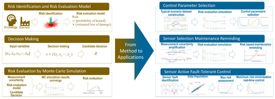 Since risk is always linked to unpredictable random events, one can base its anticipation on predictions through simulations based on data collected on its influence parameters. Here, one is particularly interested in decision risk linked to data quality failures. Figure 3 shows the proposed risk assessment and alleviation framework. The brown section on the left describes the three main stages of assessment of decision risk: risk identification, decision-making, and decision-making risk assessment through Monte Carlo simulations. The blue part on the right shows the three applications of risk alleviation based on decision-making risk, including control parameter selection, sensor selection, sensor selection maintenance reminding, and sensor active fault-tolerant control.