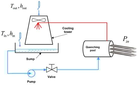 Let us illustrate this approach with a simplified example. Consider a steel plant where cooling systems utilizing heat exchange are essential for transferring heat from the continuous quenching station to the surrounding environment. The cooling system consists of a cooling tower, quenching pool, water pump, valves, and pipes. A schematic diagram of the operation of the system is shown in Figure 4. Currently, manufacturers are maximizing cooling tower ventilation, resulting in a great deal of wasted energy. The dynamic adjustment of cooling capacity optimizes energy consumption, but engineers are concerned about the risks associated with poor data quality in the field. Therefore, how to balance the demand for energy conservation and potential risks has become an important decision-making problem faced by the plant. The difficulty in the dynamic adjustment of cooling power lies in the fact that the temperature and humidity changes in the environment affect the cooling power. For example, when the humidity of the air inlet of the cooling tower is very high, the efficiency of water–gas heat exchange will be greatly reduced.