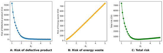 Let us define the cost unit by . The loss is when all products are defective in a control period, which is spent on reprocessing. According to Equation (5), the defective production risk in one control is expressed in Equation (A9):