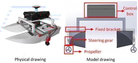 As shown in Figure 1, this paper enhances the traditional catamaran structure. In the traditional catamaran, the propeller is typically fixed at the rear of the hull. The disadvantage of this structure is that it can only exert longitudinal force on the hull. To overcome this problem, this paper employs fixed brackets to connect the propeller to waterproof steering gears and positions them on both sides of the USV. The steering gear rotates to drive the propellers to rotate, enabling the thrust generated by the propellers to be distributed in all directions. The ship-based system is located in the control box.
