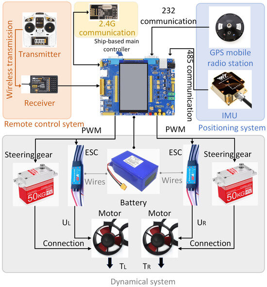 As shown in Figure 2, the ship-based control system is composed of four main components, namely ship-based main controller, positioning system, remote control system, and propulsion system.