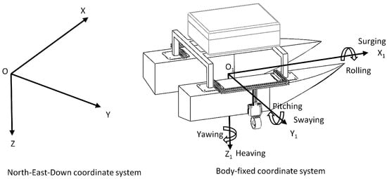 The motion of the USV is classified as a six-degree-of-freedom state of motion, which is generally described based on two coordinate systems: a North-East-Down coordinate system, with the center of the Earth as the origin of the coordinates, and a body-fixed coordinate system, with the USV itself as the origin of the coordinates.