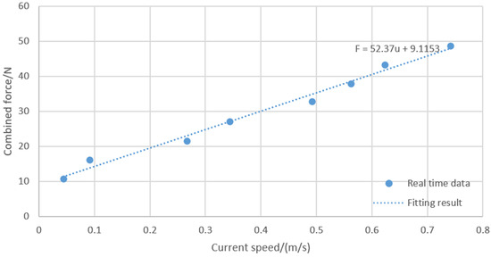 The experiment of uniform linear motion with different speeds was designed, and the real-time data were collected using the host computer to obtain the correspondence between the combined force and the current speed, and the experimental data are shown in Table 3. The fitting of the combined force and velocity is shown in Figure 5.