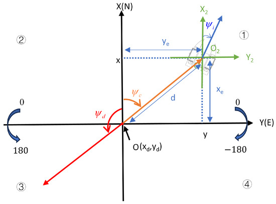 Based on the positivity and negativity of and , we specify in which quadrant the USV is located at the target point. Quadrant ➀➁➂➃ is as follows:
