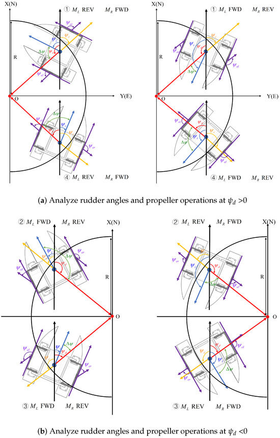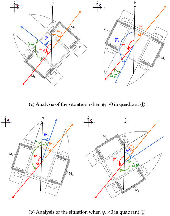 As shown in Figure 8, it is assumed that the USV is in the first quadrant, and its actual position remains unchanged during the steering process. Additionally, the position of the target point is fixed. According to Equations (24) and (25), it can be analyzed that the values of and remain unchanged. The USV regulates the actual yaw angle through differential steering of the propellers, so only the value of changes. Since the value range of the angles in the heading coordinate system and the ship coordinate system are the same, the angular representation in the heading coordinate system can be discussed in the ship coordinate system. The two cases in Figure 8a are used as examples to analyze the operating state of the propellers when tracking the desired yaw angle.