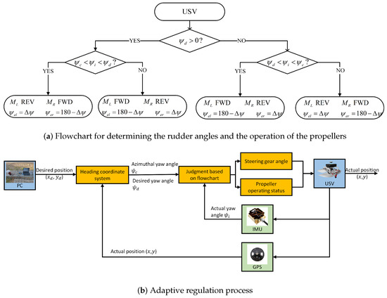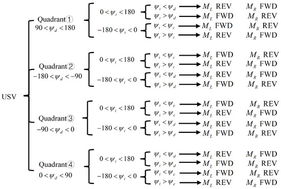 As shown in Figure 8a, when the value of the actual yaw angle, , is greater than 0. If is less than , the right propeller, , should rotate forward and the left propeller, , should rotate backward. This is to push the USV to turn counterclockwise so that converges to . If is greater than , then the left propeller, , rotates forward and the right propeller, , rotates backward, pushing the USV clockwise so that converges to .