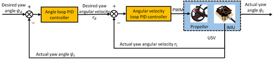 The heading control of a USV is designed to rapidly change the actual yaw angle to the reference yaw angle and to minimize the amount of overshoot. In previous research, PID controllers were first proposed and applied to real ship heading control [9]. However, in simulations and field experiments, the USV is susceptible to model perturbations and environmental disturbing forces, making it difficult for the PID controller to maintain a consistent control performance, and parameters need to be readjusted to stabilize the system [10,11]. Therefore, a control method with good robustness and adaptability is needed. Wu et al. [12] added a tracking differentiator to a model-free adaptive controller and designed a controller for complex systems such as nonlinear, time-delayed, time-varying, and strongly coupled. Bu et al. [13] considered the data-driven control (DDC) problem for a class of non-affine nonlinear systems with output saturation based on model-free adaptive control theory. In 2018, Li et al. [14] designed a PID-MFA cascade controller based on model-free adaptive control theory to realize the heading control of USVs through angular velocity guidance. In 2019, to address the problem that the USV heading subsystem does not satisfy the quasi-linear assumption, Liao et al. [15] redefined the output of the USV as a linear sum of heading and angular velocity, and based on this redefinition proposed a free adaptive control method for the compact format model. However, the above methods are more dependent on the accuracy of the motion model, complicated in design, have high environmental uncertainty, and have not been applied in real environments. Based on the heading coordinate system and ship coordinate system, this paper designs a method of tracking and maintaining the desired heading yaw using differential speed control, and establishes a cascade PID controller to optimize the control accuracy. Finally, it is practically applied to USVs and achieves a good heading control effect.