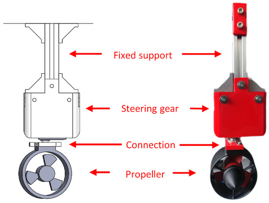 As shown in Figure 12, the hardware component of the adaptive adjustment mechanism mainly comprises steering gears, propellers, connections, and fixed supports. The rotation of the steering gear drives the rotation of the propeller, thereby adjusting the direction of thrust and enabling the USV to output thrust in any direction. The aforementioned program provides hardware support to overcome the transverse drift motion.