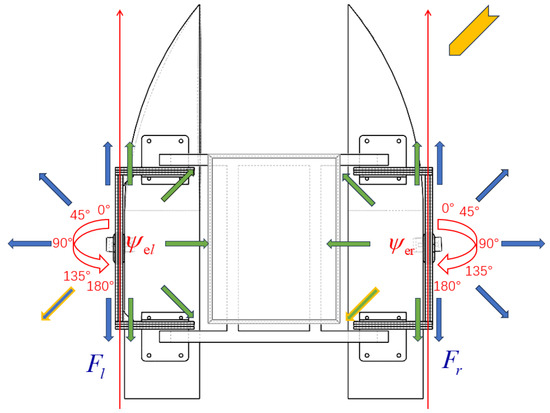 As shown in Figure 13, is the rudder angle of the left steering gear of the USV, and is the rudder angle of the right steering gear, both of which are oriented with the ship’s bow facing 0°. The angle ranges are shown in Figure 13. The blue arrows indicate the direction of thrust generated by the forward rotation of the propellers when the steering gears are rotated at different angles. The green arrows indicate the direction of thrust when the propellers are reversed. Although the steering gears rotate only 180°, the propellers can generate thrust in the opposite direction, allowing for a 360° thrust distribution. Assuming that the yellow arrow in the figure indicates the disturbance caused by wind and wave currents, in order to overcome the effects caused by this disturbance, the angle of the steering gears on both sides and the forward and reverse rotations of the propellers are controlled so that the thrust output of the USV is counteracted with the disturbance, which is represented as blue and green arrows with a yellow outer frame in Figure 13.