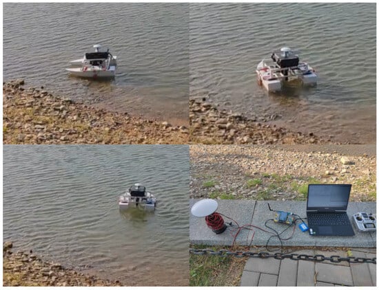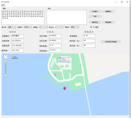 In order to verify the application of the methodology used in this paper in real navigation control, navigation experiments were carried out on a lake within the Garden Expo Park in Changqing District, Jinan City. The data obtained from the USV were transmitted to the upper computer through the wireless module to display and create an Excel table to store the data. Figure 16 and Figure 17 show the experimental real picture and the schematic diagram of the upper computer.