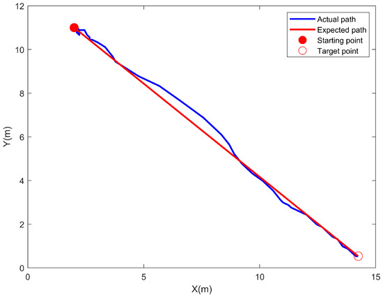 As shown in Figure 18, the latitude and longitude are converted to planar coordinates for analysis after Mercator transformation. The horizontal coordinates are the transformed coordinates of the longitude information, and the vertical coordinates signify the transformed coordinates of the latitude information. The positive direction of the Y-axis is northward. In this paper, curved path following is not explored. Hence, the starting point and the goal point are connected by a straight line, which serves as the desired path. Initially, the USV tracks the desired yaw angle by differential steering, resulting in the USV moving irregularly around the starting point. After the steering is completed, the USV follows the desired path. However, there is uncertainty regarding the cause of the USV’s deviation in tracking the path since disturbance information like wind and wave currents is not directly measured. Nevertheless, after a significant deviation occurs, adjustments can be made to reduce the deviation from the desired path and fulfill the purpose of tracking to the desired path.