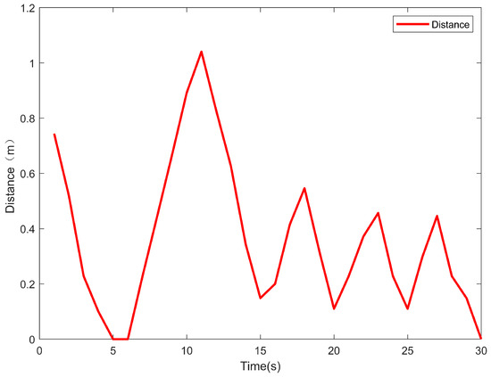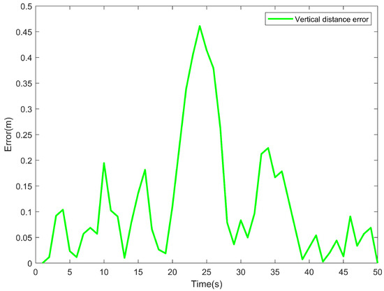 As shown in Figure 19, in order to visualize the effect of the USV tracking the desired path, a vertical distance figure between the actual trajectory points and the desired path is established. It can be observed from the figure that the vertical distance between the USV and the desired path is consistently less than 0.5 m. Since the width of the ship is 0.8 m and the GPS module is located in the center of the USV, the distance from the GPS module to either side of the USV is approximately 0.4 m. Thus, the deviation is within the acceptable error range of 0.5 m. Initially, the vertical distance deviation caused by adjusting the actual yaw angle was less than 0.2 m. Subsequently, due to interference factors, the deviation increased. However, after adjustment, the vertical distance was significantly reduced, indicating that the purpose of anti-interference was accomplished.