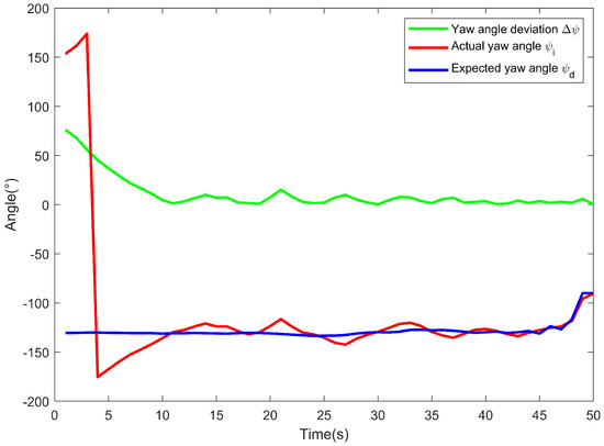 As shown in Figure 20, the desired yaw angle, , as an input to the angular cascade PID controller is based on the coordinates of the USV in conjunction with Equations (24) and (25). The actual yaw angle, , as the output and feedback to the angular cascade PID controller is obtained directly from the IMU module. At the outset, the actual yaw angle of the USV was 153.334°, while the desired heading angle was −130.515°. In combination with the angle values of the coordinate system established in Section 4 and Figure 9, it is determined that the USV needs to turn counterclockwise in order to turn through the smallest angle to track the desired yaw angle, so the actual yaw angle first converges to 180° and then turns negative before converging to the desired yaw angle. As the motion progresses, the angular cascade PID controller regulates the yaw angle by adjusting the rotational speed of the propellers, and the yaw angle deviation gradually approaches a steady state, reflecting a excellent heading control effect and fulfilling the purpose of USV heading maintenance.