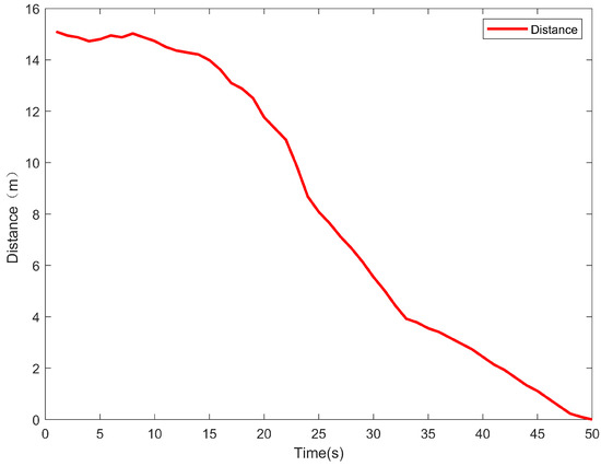 As shown in Figure 21, initially, the distance change is minimal due to the in-place differential steering of the USV for adjusting the yaw angle, which is consistent with the previous analysis. After adjusting the actual yaw angle to be consistent with the desired yaw angle, the distance from the target point decreases rapidly, signifying that the USV is moving swiftly toward the target point. Finally, the reduced speed for distance changes indicates that the positional cascade PID controller regulates the speed of the USV and prevents overshooting of the USV speed caused by excessive velocity.