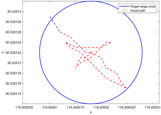 As shown in Figure 22, latitude and longitude are converted to planar coordinates following Mercator transformation for analysis. The positive direction of the Y-axis is northward. Most of the paths shown in the figure are situated within a circle centered on the target point with a radius of 1 m. At this juncture, the steering gear begins to operate in conjunction with the propellers to adjust the actual position of the USV in the wind- and wave-disturbed environment. As can be observed from the figure, after the USV enters into the circle, it continuously adjusts near the target point. Since the GPS module is installed at the center of the USV, the path shown in the figure is the outcome of the transformation of the collected latitude and longitude information. Thus, the path showcases the adjustment process of the center of the USV. The length of the USV is 1 m and the width is 0.8 m. Although the center of the USV cannot be constantly maintained at the target point, the majority of the hull of the USV is within the circle and the distance from the target point is small in comparison with the size of the boat. Therefore, it essentially accomplishes the purpose of dynamic positioning.