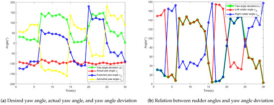 As shown in Figure 14, the values of the rudder angles are related to the value of deviation angle between the actual yaw angle and the desired yaw angle. The angle of the steering gear on the side where the propeller is reversed is equal to the value of deviation angle , and the angle of the steering gear on the other side is . Based on this logic, it is also possible to determine the rudder angles and propeller operations when the desired yaw angle < 0 in Figure 14b.