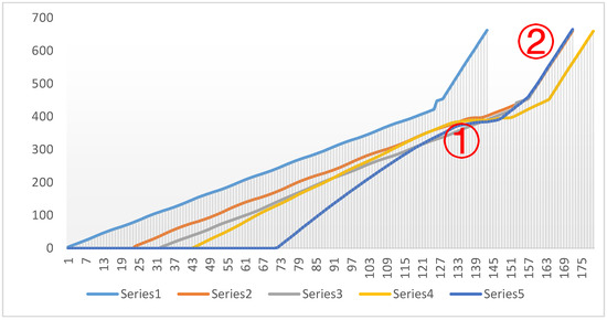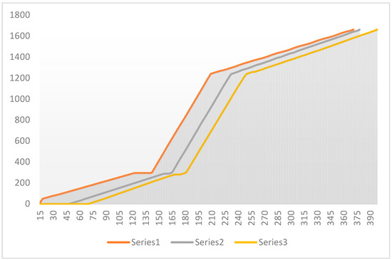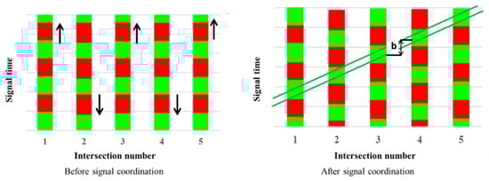 A simple example of Equations (5) and (6) is shown by Figure 5. This example is shown as an illustration of a three-intersection arterial network. The red solid lines indicate the red signal. The green band indicates the green wave.