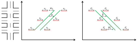 where C represents the cycle length of the traffic signal, while w i signifies the time interval between the end of red time and the commencement of the bandwidth on the inbound direction. Similarly, w i ¯ denotes the time interval between the end of red time and the initiation of bandwidth on the outbound direction. The variable b is designated as the bandwidth variable, and r i represents the red time on the inbound direction, with r i ¯ representing the red time on the outbound direction.