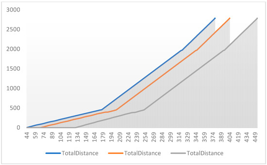 Figure 22. Vehicle trajectory diagram with the speed strategy for multiple intersections.