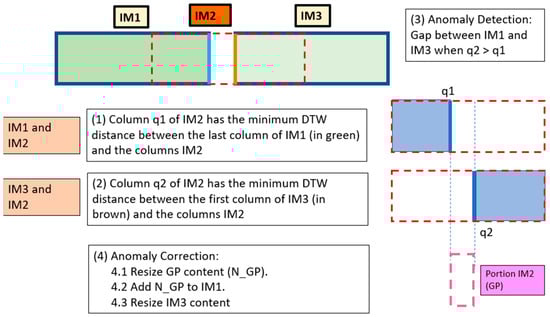 The acquisition of an image every IW/2 m as well as the use of DTW and WD distances to detect and correct anomalies are the most original aspects of the algorithm. DTW distance has been found to be useful here for obtaining distances between columns of different images. OVERGAP detects anomalies using DTW. The WD determines the difference in scale between columns with the same information. OVERGAP uses WD to correct anomalies by resizing an image.