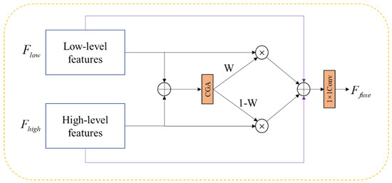 The baseline model utilizes a feature fusion method involving upsampling and concatenation. However, this element-wise addition approach lacks flexibility and may not align receptive fields effectively [42]. In infrared images, low-level features typically capture edge and texture information, which is crucial for distinguishing low-contrast targets from the background, identifying objects with similar thermal characteristics, and filtering out noise. In contrast, high-level features capture semantic information and recognize complex patterns. Due to the significant differences in the encoded information and receptive fields [43] between low-level and high-level features, simple concatenation can lead to ineffective integration, resulting in potential information loss or distortion and adversely affecting detection performance. To address these challenges, we introduce a fusion scheme based on an attention mechanism—CGA Fusion.