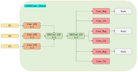 The baseline model incorporates three distinct detection modules, each designed to identify small, medium, and large targets at the P3, P4, and P5 scales, respectively. Each module employs a decoupled head approach, separating classification and regression tasks into two distinct computational branches. This design results in the detection head consuming approximately one-fifth of the network’s total computational resources, leading to a substantial number of parameters that complicate the deployment of the infrared detection algorithm on edge devices. To address this challenge, we propose utilizing shared convolutions, as illustrated in Figure 5.