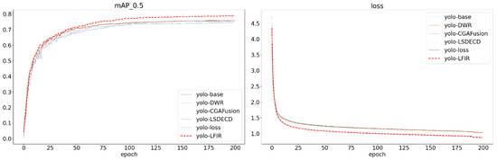 In the experiment, the Faster R-CNN model used ResNet-50 as the backbone, as it provides a good balance between depth, feature extraction capability, and computational complexity. The learning rate, optimizer, and batch size are consistent, as shown in Table 1, with the RPN (Region Proposal Network) positive-to-negative sample ratio set to 1:3. The anchor scales were set to [128, 256, 512] and the anchor ratios were set to [0.5, 1.0, 2.0], with a total of 100 training epochs. For the SSD model, the input image size was set to 512 × 512, with an initial learning rate of 0.01, and a learning rate decay strategy was applied. The momentum was set to 0.9 to accelerate training and avoid oscillation. Six anchor boxes were used for target detection at different scales and aspect ratios, with a batch size of 16, and training was conducted for 200 epochs. The hyperparameters for the YOLO series were consistent, as shown in Table 1, to minimize the impact of hyperparameter settings on model performance. The comparative analysis of the experimental results is detailed in Table 4.