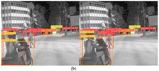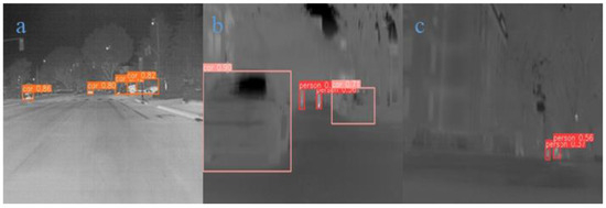 In Figure 8a, vehicles are distributed at varying distances, representing a typical multi-object detection scene. Additionally, the vehicle in the middle is a distant target. The model successfully detected multiple vehicles and provided high confidence scores, demonstrating good performance in recognizing vehicle targets. The fact that the model can accurately detect both near and far objects indicates that its ability to handle multi-scale targets has been enhanced. Similarly, in Figure 8b, the vehicle in the foreground appears to be dynamically blurred, suggesting that the vehicle is in motion. The model was able to detect the target with high confidence, indicating that the improved loss function endows the model with robustness when dealing with dynamic targets. The enhanced feature extraction module may have contributed to the model’s ability to detect dynamically blurred objects. Moreover, Figure 8c represents a low-contrast outdoor urban scene where the detection system must capture and recognize distant pedestrian targets despite the small temperature differences. However, the model showed lower confidence in detection, suggesting that while the improved model can detect targets, it still has limitations in distinguishing distant targets with weak thermal radiation in low-contrast environments. In the future, data augmentation strategies could be employed to increase training data for low-contrast targets, or thermal source-based enhancement strategies could be developed, which would assign greater weight to thermal intensity and help the model better handle specific challenges in low-contrast scenarios.