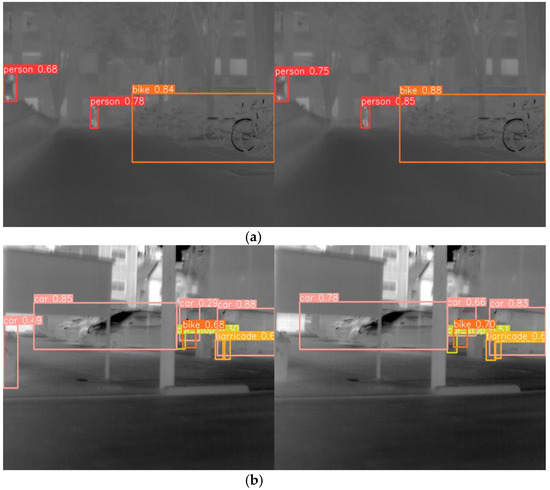 To better evaluate the model’s generalization ability, we used two datasets to test the performance of the improved model—the publicly available FLIR infrared dataset released by Teledyne and the multispectral dataset from the University of Tokyo. The FLIR dataset we used was the latest v2 version. The total number of annotated frames in this version of the dataset has been expanded from 14,452 to 26,442, covering both infrared and visible light components. However, most of the images lack registration between the two modalities. The data were collected using a pair of thermal imaging and visible light cameras mounted on a vehicle. The thermal imaging camera used was the Teledyne FLIR Tau 2, with a resolution of 640 × 512 and a 13 mm focal length lens. It offers a 45-degree horizontal field of view (HFOV) and a 37-degree vertical field of view (VFOV), allowing the capture of high-resolution infrared images within a relatively wide field of view. Each frame in the dataset was sampled from entirely independent video sequences, encompassing various locations and weather conditions. We ultimately selected five target categories—person, bike, car, motor, and bus. A total of 11,329 images were selected from the original training and validation sets and were re-divided into a training set and validation set in an 8:2 ratio, resulting in 9063 images in the training set and 2266 images in the validation set. The original test set remained unchanged.