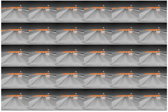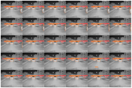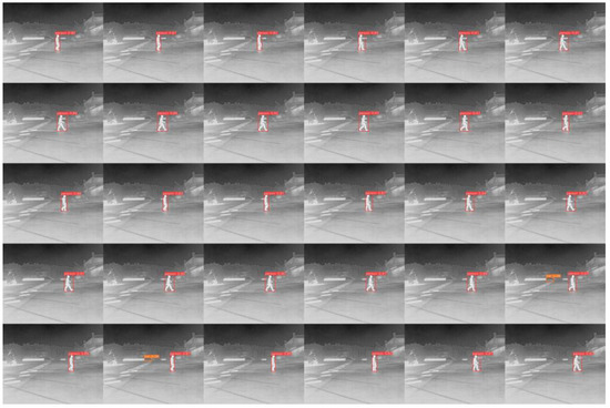 In our experiment, we conducted a detailed analysis of object movement across different scenarios to evaluate the model’s performance in complex dynamic environments. By conducting experiments on three representative cases, we demonstrated the model’s robustness and detection accuracy in tracking moving objects. The scenarios included a regular traffic road environment (Figure 13a), a pedestrian walkway environment under very low light at night (Figure 13b), and a high-speed road environment with strong light conditions (Figure 13c). The scenario images are derived from the FLIR dataset, and the data for each scenario consist of a series of continuous frames captured at 30 FPS, which fully demonstrate the test intensity and real-time performance of dynamic object detection. We selected 30 image frames captured within one second as visualization results to illustrate the model’s detection performance with moving objects, and the results are presented in Figure 14, Figure 15 and Figure 16. The test results show that, in all three complex scenarios, the detection confidence of the model reaches approximately 90% for moving objects, indicating stable recognition capability in various real-world applications.