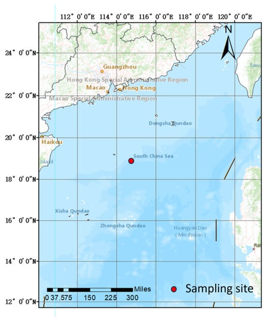 A sediment column was collected from the Northern Slope of the South China Sea (18°53.03′ N, 114°47.29′ E) in September 2020 using an SDIOI-SC100 gravity column sampler (Figure 1). This is one of the most important tropical ecosystems in China, including coral reefs, mangroves, seagrass beds, etc. It is rich in resources for the biological carbon pump []. The sampler was constructed from stainless steel and had a weight of 100 kg. The length and inside diameter of the inner tube of the sampler were 180 cm and 12 cm, respectively.