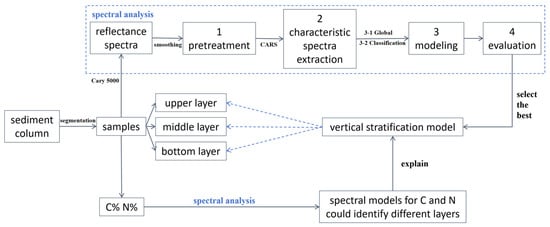 Traditionally, stratifying vertical profiles in marine sediments is usually carried out in a lab and is laborious, time-consuming, and costly [,]. Therefore, new technologies are urgently needed for rapidly determining vertical stratification [,]. Visible and near-infrared reflectance spectroscopy (VNIR) is a green technology with fast speeds, high sensitivity, and easy operation, being widely used in many fields [,]. In sediments or soils, many achievements have been made in spectral analysis of parameters by VNIR, e.g., clay content, particle size, total carbon, organic carbon, and total nitrogen [,,,,].