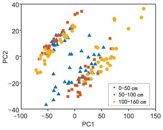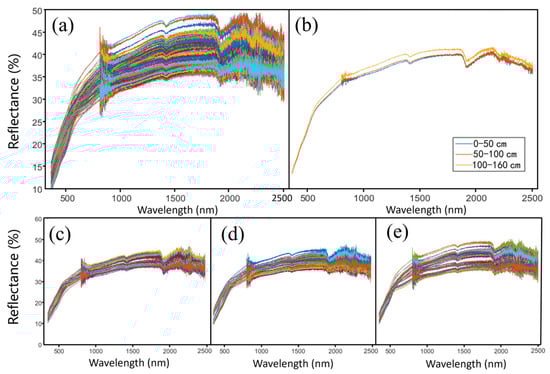 The three layers had different reflectance spectra (Figure 4b). The bottom layer (100–160 cm) had the largest reflectance rates compared to the other layers. The upper layer (0–50 cm) had the smallest reflectance rates but had no significant difference compared to the middle layer (50–100 cm).