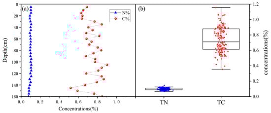 Chemical distribution of total carbon and total nitrogen. (a) Concentrations of total carbon and total nitrogen in the sediment profile, (b) boxplot of total carbon and total nitrogen.