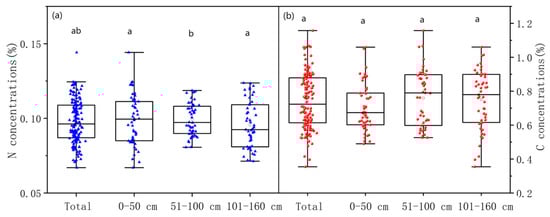 Boxplot of concentrations of total nitrogen (a) and total carbon (b) in all samples and different layers. In each subfigures, the characters “a”, “b”, and “ab” are the results of ANOVA for average concentrations of total carbon and total nitrogen.