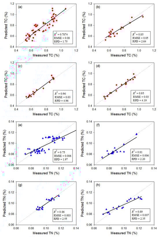 Indeed, TC and TN could be accurately determined by spectroscopy. In our study, spectral models for TC and TN performed better for each layer (Figure 8). For the TC models, the determination coefficient (R2) was as high as 0.96, and the relative prediction deviation (RPD) was as high as 4.7 (Figure 8c). The TN models performed as well as the TC models (Figure 8).