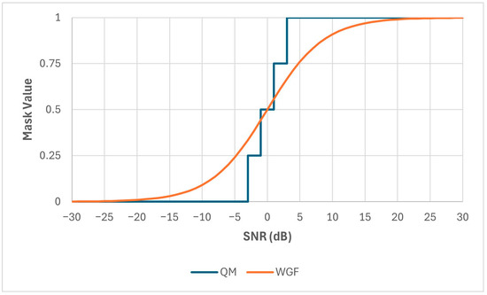 Two new masks are proposed in this paper. The first mask is inspired by the IBM but has multiple local SNR thresholds rather than just one. In essence, it is a quantized approximation to the Wiener Gain Function (WGF) [40,41] and hence is referred to here as the Quantized Mask (QM). The number of local criteria and their respective values have been derived empirically to optimize the STOI score, and the mask is defined in Equation (15) as follows: